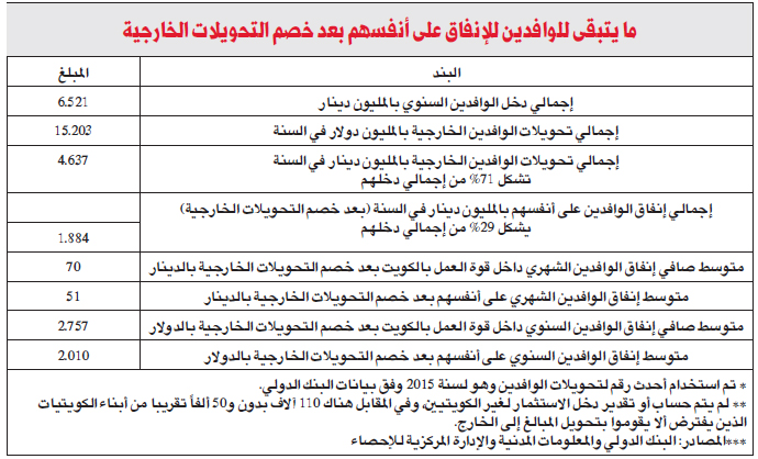 إلى ذلك، هناك ما يقارب 19 ألف غير كويتي عاطل عن العمل وأكثر من 814 ألف غير كويتي خارج قوة العمل أو طالب أو صغير في السن. ما يجعل الإجمالي 3.07 ملايين غير كويتي يحصلون على 6.5 مليارات دينار كدخل سنوي وبمتوسط دخل شهري 177 ديناراً أو 6956 دولاراً سنوياً للفرد. ولو طرحنا من الإجمالي مبلغ تحويلات الوافدين للخارج، وهو 15.2 مليار دولار أو 4.6 مليارات دينار حسب بيانات البنك الدولي لسنة 2015، الذي يمثل %71 من إجمالي ما يحصل عليه الوافدون من رواتب. لكان متوسط ما ينفقه الوافد على نفسه وعلى أسرته الموجودة في الكويت هو 51 ديناراً شهرياً للفرد أو 2010 دولاراً في السنة لكل فرد غير كويتي والذي يمثل %29 فقط من دخله. (لا تحتاج العمالة المنزلية للإنفاق على الأساسيات لكن يصعب فصل مبالغ التحويلات الخارجية حسب نوع العمالة)