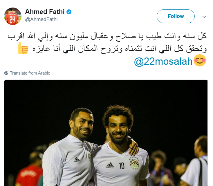 ونشر فتحى صور تجمعها عبر حسابه بموقع التدوينات الصغيرة "تويتر"، معلقا عليها: "كل سنة وأنت طيب يا صلاح وعقبال مليون سنه وإلى الله أقرب وتحقق كل اللى أنت تتمناه وتروح المكان اللى أنا عايزه".