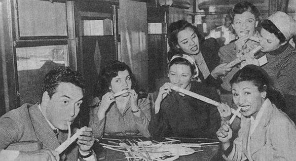 وفي صورة نادرة اجتمعت ثريا مع عدد من زملائها داخل كابينة القطار، وقد اندمجوا في «مصّ قصب السكر».