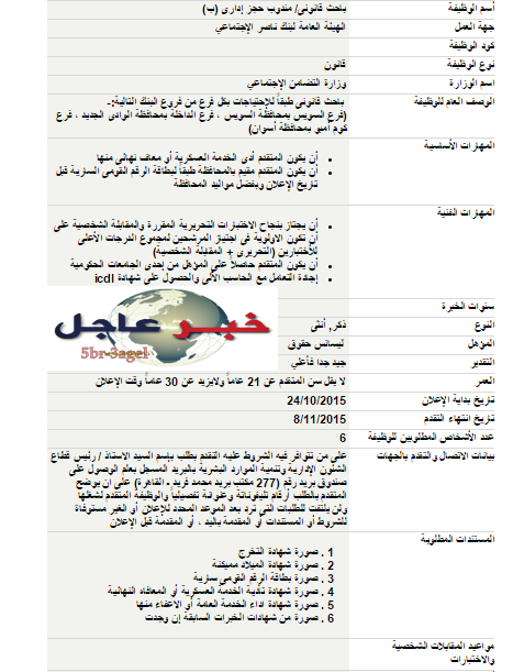 على ان يكون المتقدم من خريجى كليات الحقوق ويكون نهاية التقديم على هذة الوظائف 8 / 11 / 2015 للذكور والاناث